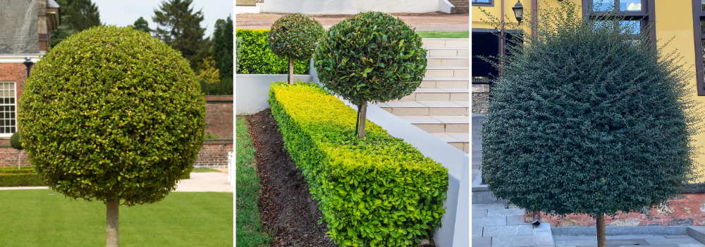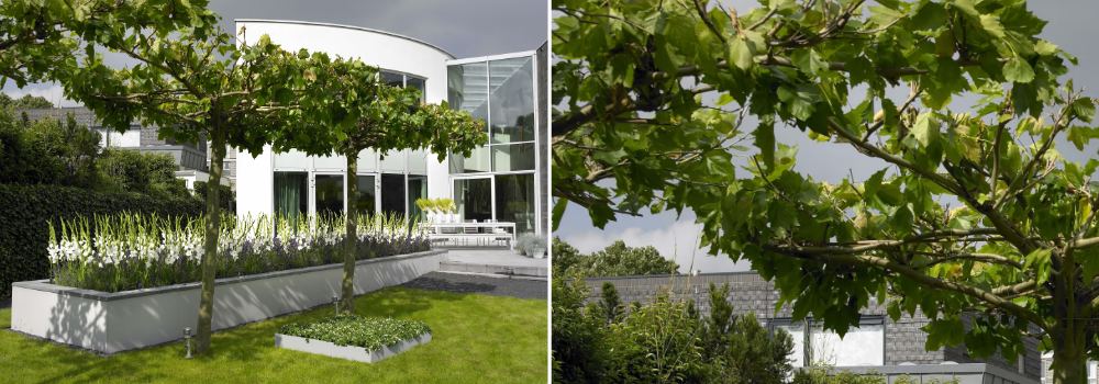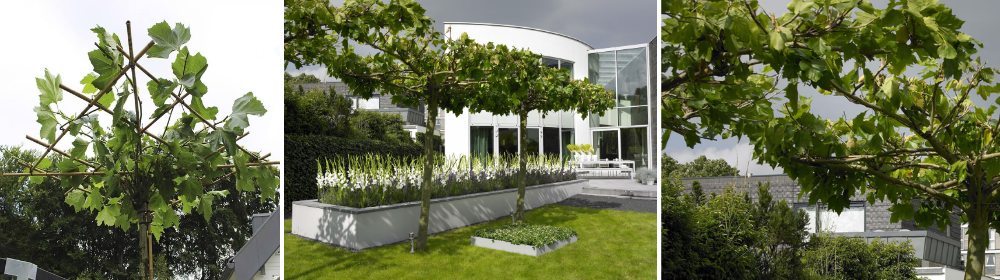 Nedenstående billede viser platantræer på række, som danner en flad hæk (parasol), men man kan også få dem, hvor grenene er oprejste (espalier).
