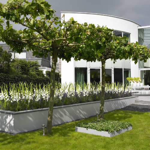Her er der plantet Platantræer på række som danner en flad hæk (parasol), men man kan også få dem, hvor grenene er oprejste (espalier).