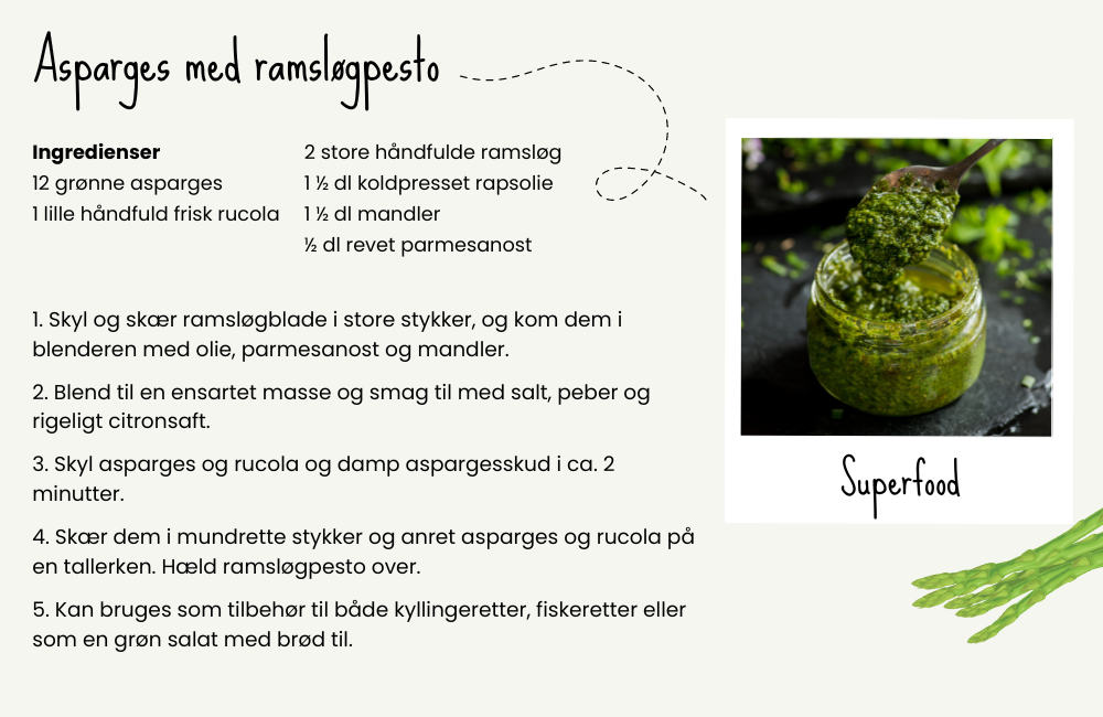 Når sommeren går på hæld, er der masser af skønne planter i haven, som skal udnyttes. Denne lækre opskrift på asparges med ramsløgpesto bruger et væld af forskellige grøntsager og urter, du kan finde i haven, og så er den nemt at lave. Dét er superfood!