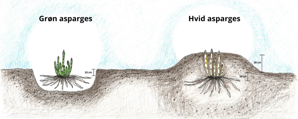 Det er en lidt anden metode, hvis du ønsker hvide asparges. Hvide asparges er egentlig den samme plante som ved grønne, forskellen er bare, at de er blevet nedgravet yderligere så skuddene blegnes. For at få hvide asparges skal du plante dem i en 25 centimeters dybde og 30 centimeters bred rille. Planterne sættes og dækkes til med ca. 8 centimeters jord. Når asparges stænglen vokser og pibler frem, dækkes den til med jord, sådan at den lige præcis altid er dækket. Man ender faktisk med at hyppe sine hvide asparges, som man gør med kartofler, helt op i en 35 centimeters højde over kammen.