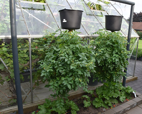 At dyrke tomater på hovedet i spande eller i specielle poser er ikke en ny dyrkningsmetode, men det er blevet mere populært de seneste år, fordi det sparer plads og kan dyrkes på mindre terrasser og på altaner.