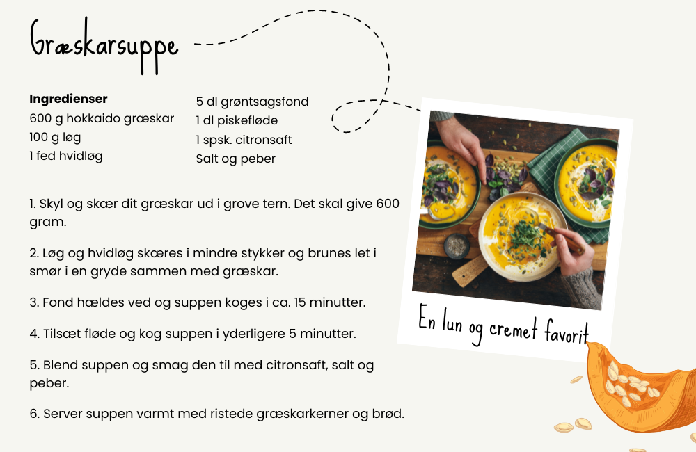 Når sommer skifter til efterår, ændrer det også på vores spisevaner. Der kommer et øget fokus på varme, krydrede retter og især supper stiger til tops på listen over vores favoritter. Her har vi samlet en opskrift til dig på lækker, cremet græskarsuppe lavet på hokkaido græskar.