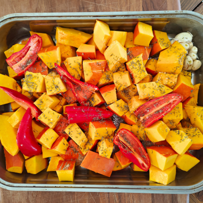 Skær alle grøntsager i grove skiver, fjern toppen af hvidløget, men lad ellers skrællen blive. Vend det hele i olie, salt og timian. Bag det i en time ved 190 grader varmluft.