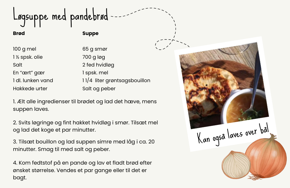 Denne opskrift er ikke kun god i efterårsmånederne, den kan også sagtens benyttes i sommerperioden. Man kan nemlig roligt lave suppen og brødet over bål, og på denne måde kan man også nemt inkludere de mindste. Har I rester af suppen, kan den roligt fryses ned og det samme gælder brødet. Brødet gør sig dog også rigtig godt dagen efter i madpakken som en lækker sandwich.