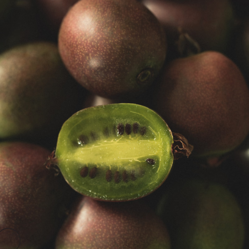 Passionsfrugter er en stedsegrøn plante, der stammer fra Sydamerika. Af den grund er planten også svært glad for tropisk varme. Lige umiddelbart lyder det jo ikke som en plante, der burde kunne trives herhjemme, men det kan den sagtens. Den er ikke hårdfør, så den største hjælp man kan give sig selv, er ved at plante den i drivhuset eller orangeriet. Det er en kraftigt voksende plante og i vækstperioden, vil man kunne se forskel fra morgen til eftermiddag. Passionsfrugten klarer sig fint både i sol og halvskygge, og eftersom de er ret tørstige, kræver de en fugtighedsbevarende og næringsrig jord. Sorten ’Purple Giant’ er mørk, når den er moden og har den perfekte, kraftfulde balance af syrlig og sød. Den oprindelige spiselige variant, Passiflora edulis er ligeledes med gråbrun skal, når den er moden, samt de lækre, gyldne kerner indeni.