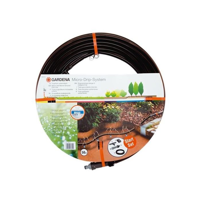 Gardena drypslange over og under jorden med en diameter på 13,7 mm installers under jorden, hvor den ikke er synlig, og hvor den vander planter og plæne. Afstanden mellem drypvanderne er 30 cm, og hver enhed vander skånsomt med 1,6 l/t. Drypvanderne er selvforseglende, så de ikke er tilstoppede, når de tages frem fra opbevring. Drypvanderne er udstyret med en rodspærring, der forhindrer, at rødder trænger ind i det underjordiske rør. Med en Basisenhed, som er installeret i midten kan drypslangen forlænges med et udvidelsessæt (nr. 1395), den maksimale længde er 200 meter. Vandtrykket er det samme overalt i drypslangen, så du opnår en jævn vanding. Drypslangen leveres klar til tilslutning til en basisenhed 1000, et endestykke og et T-stykke. Har en længde på 50 m.