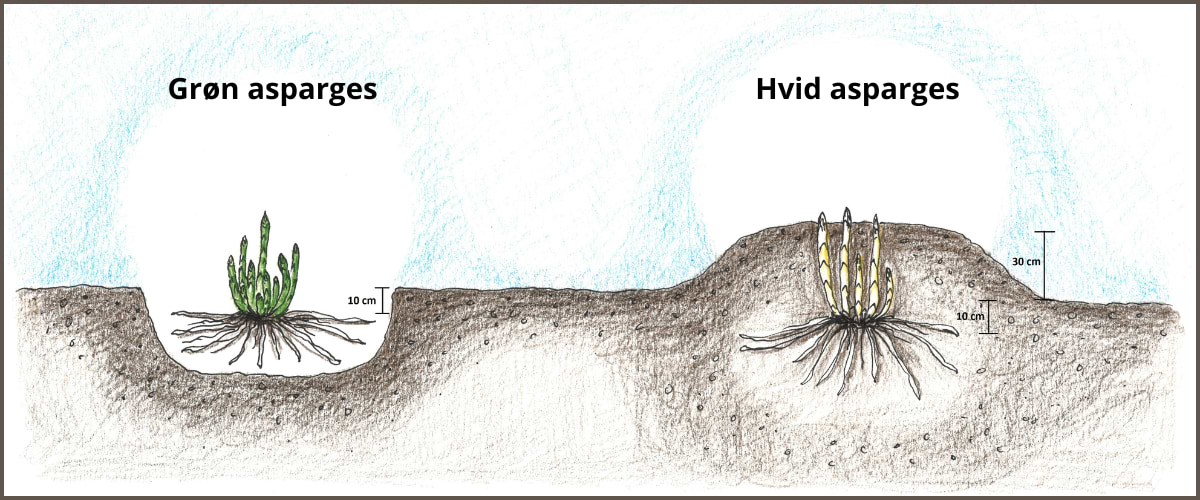 Hvide asparges plantes fra midt april til midt maj. Gerne på en varm og solrig plads i haven, da dette giver det største udbytte. Planterne plantes i ca. 15 cm dybde, med rødderne placeret vandret i løs gennemarbejdet jord. Dette gøres nemmest ved at grave en rende på ca. 40 cm bred og 20 cm dyb. Derefter løsnes jorden yderligere 25 cm længere ned. Hvis din jord er leret, anbefaler vi at jorden lettes med grus og gødet spagnum. Planterne lægges med udbredte rødder i renden og dækkes med 15 cm jord. Planteafstanden er 1 meter mellem rækkerne og 30 cm. mellem planterne.